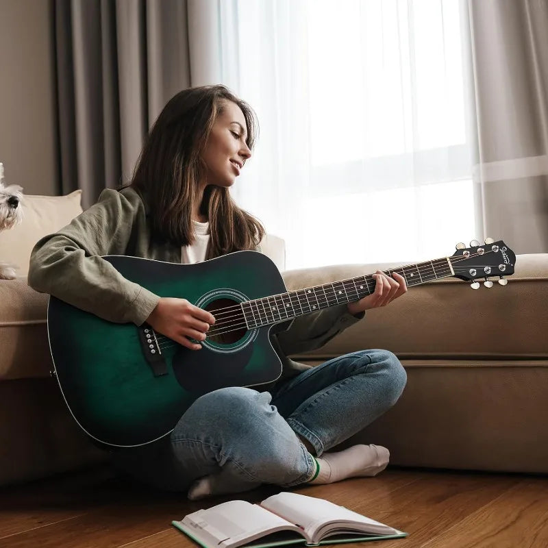 Start your guitar journey with the Glarry 41″ full-size 6-string acoustic-electric guitar kit, crafted to offer beginners a complete, performance-ready setup. This guitar features a cutaway body for better access to upper frets, a built-in tuner for easy tuning, and a compact 15 W amp so you can plug in for practice or small performances. The kit also includes a gig bag, strap, picks, spare strings, and a wrench — giving you everything you need right out of the box.