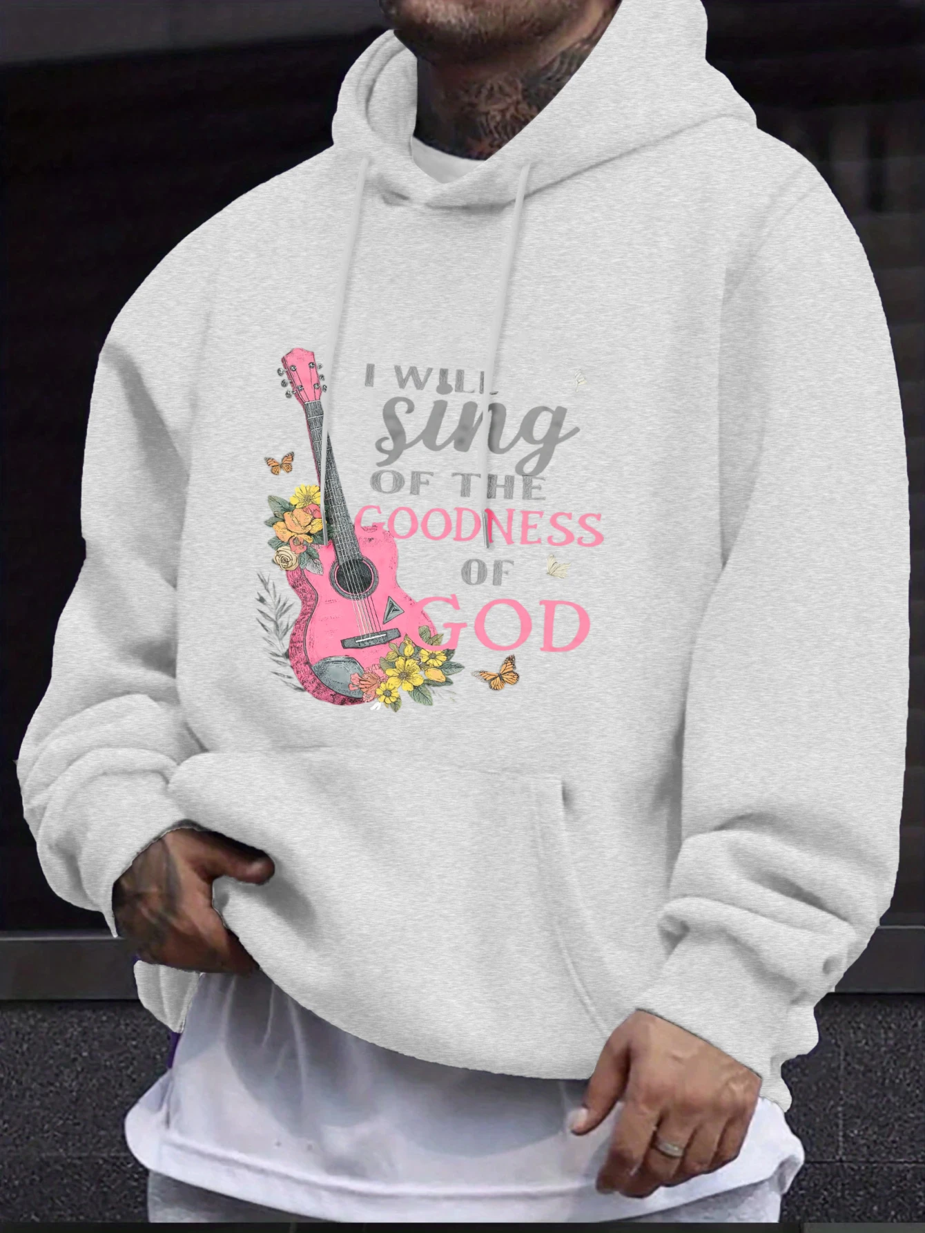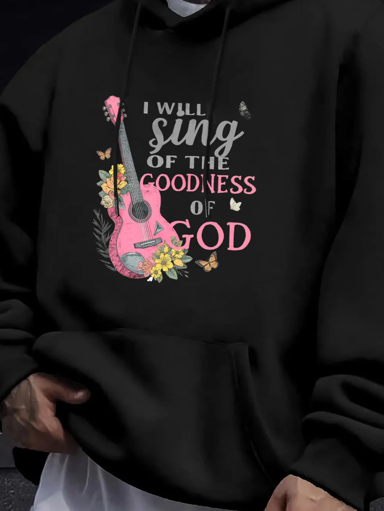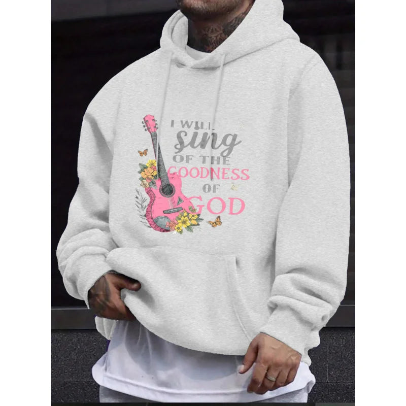Men's Hoodie Black I Will Sing of the Goodness of God Guitar Floral Print High Quality Cotton Casual Daily Wear Workout Hoodies