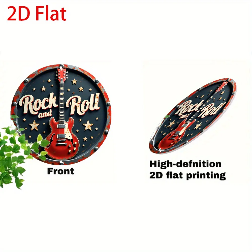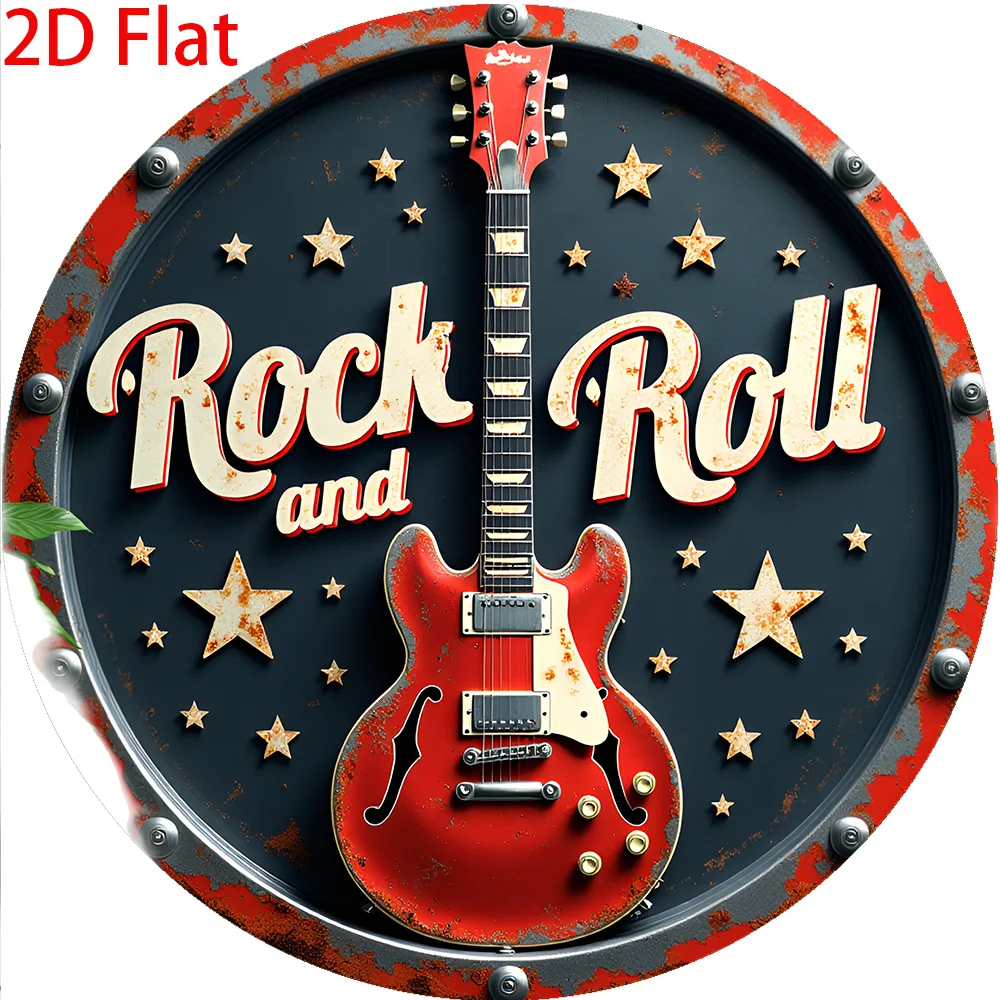 2D Flat - 1pc Retro Rock 'n' Roll Aluminum Tin Sign Wall Art - 8x8 Inch Vintage Round Metal Plaque with Red Electric Guitar & St